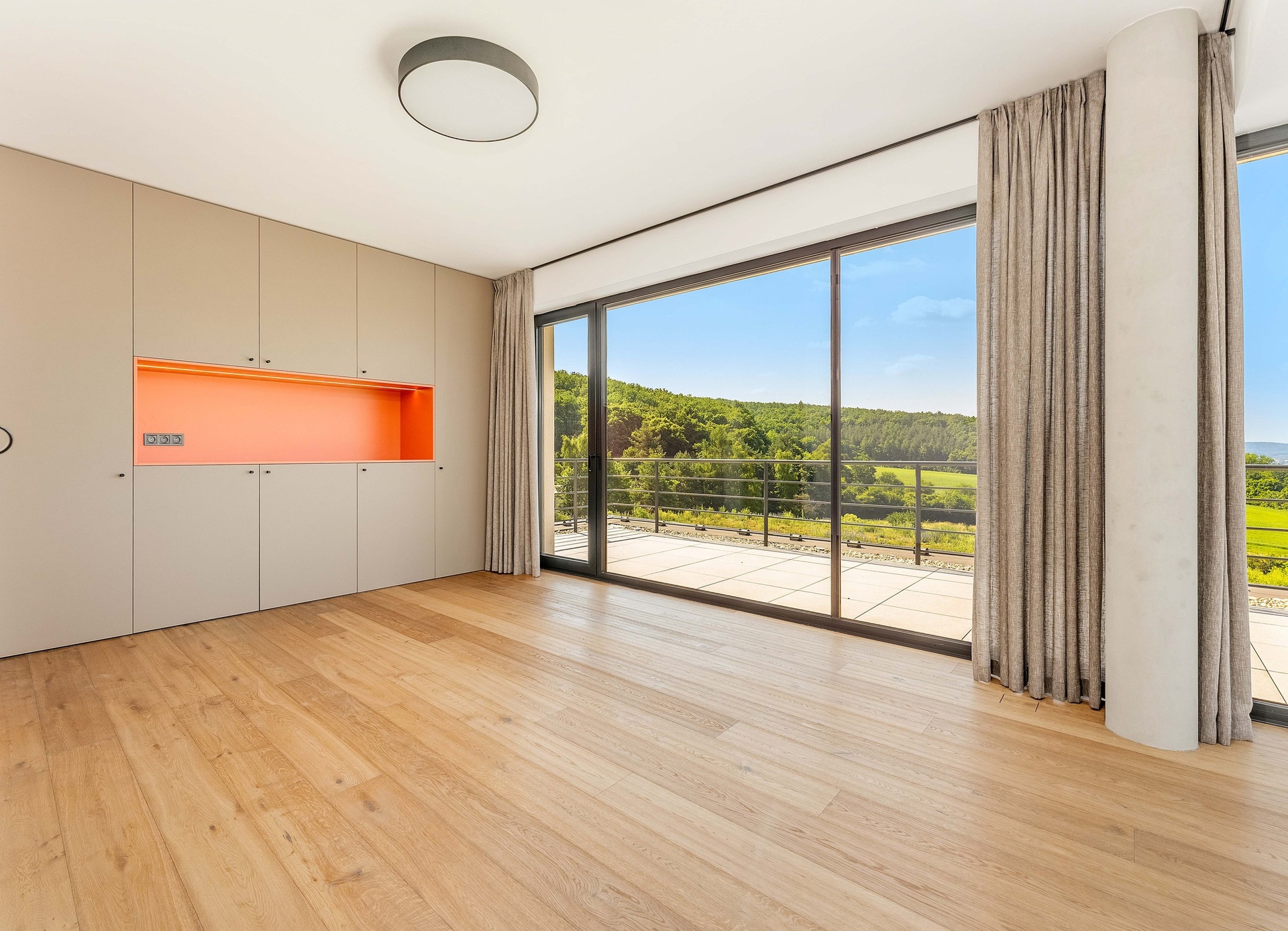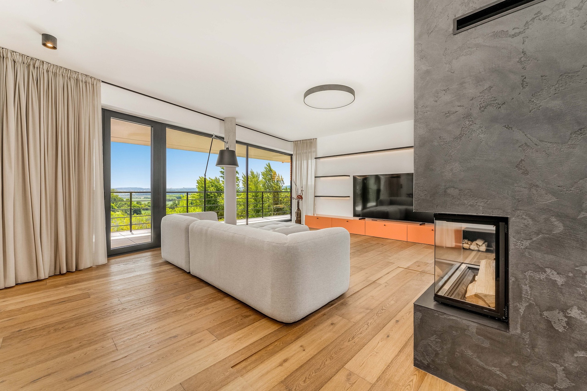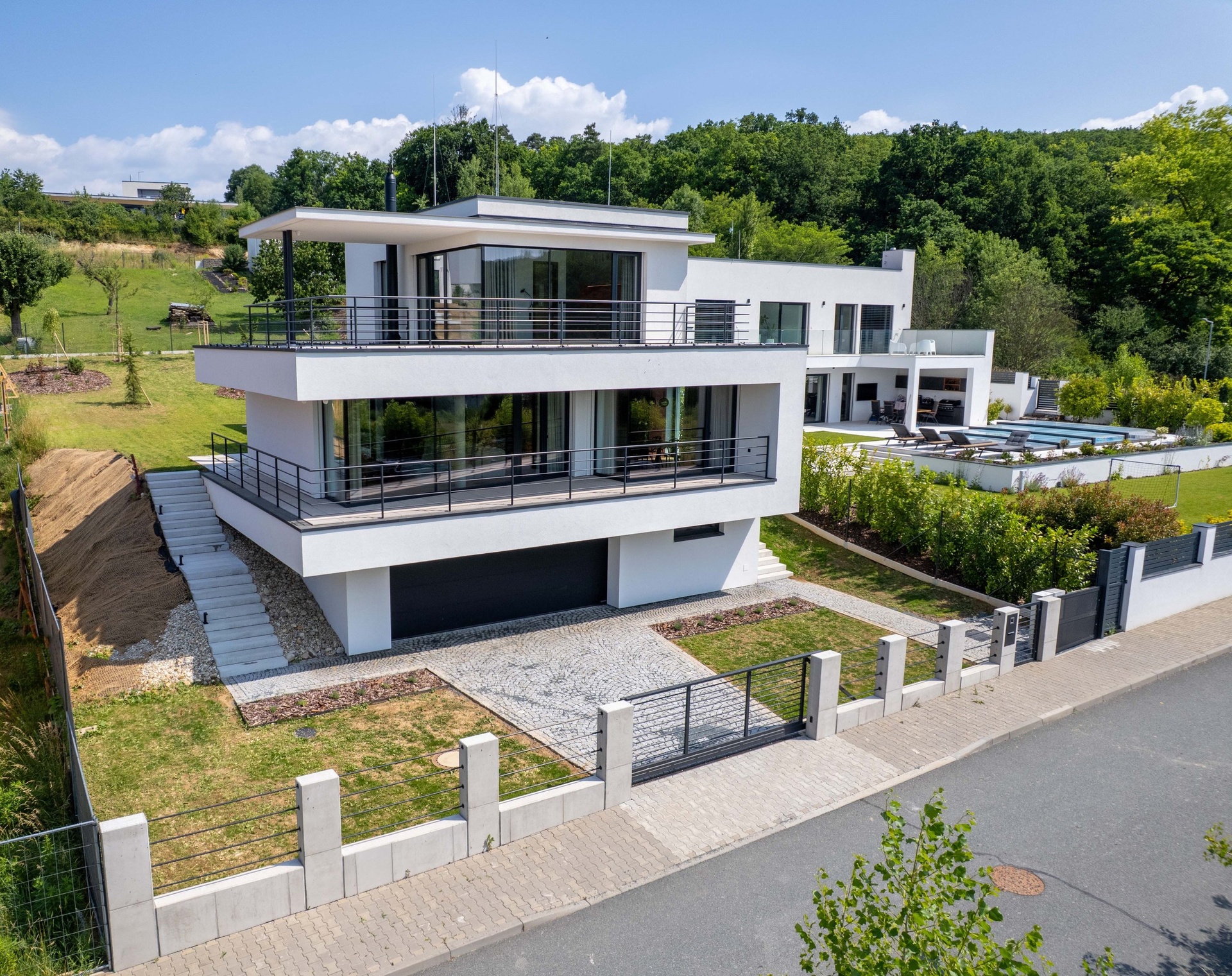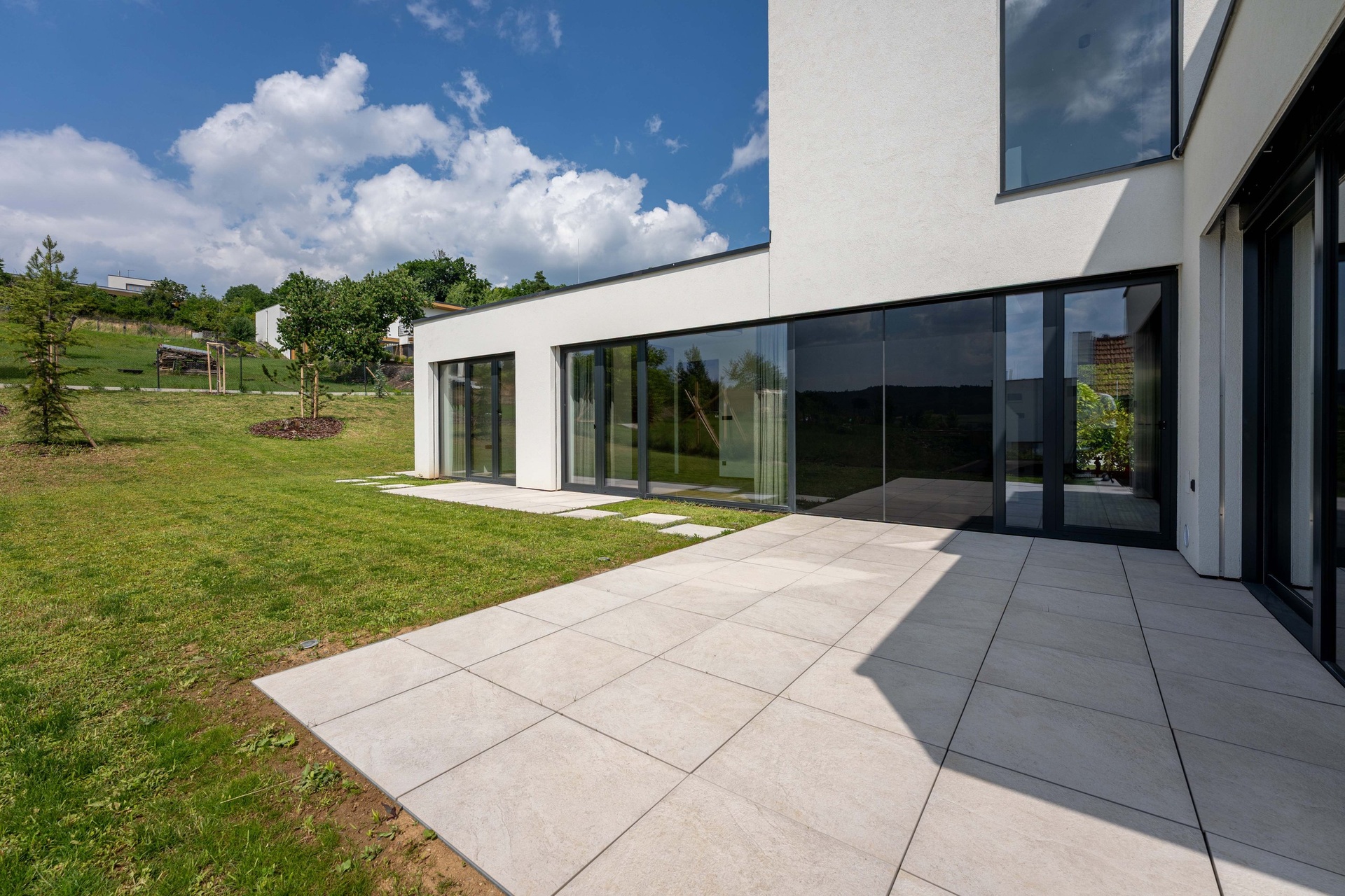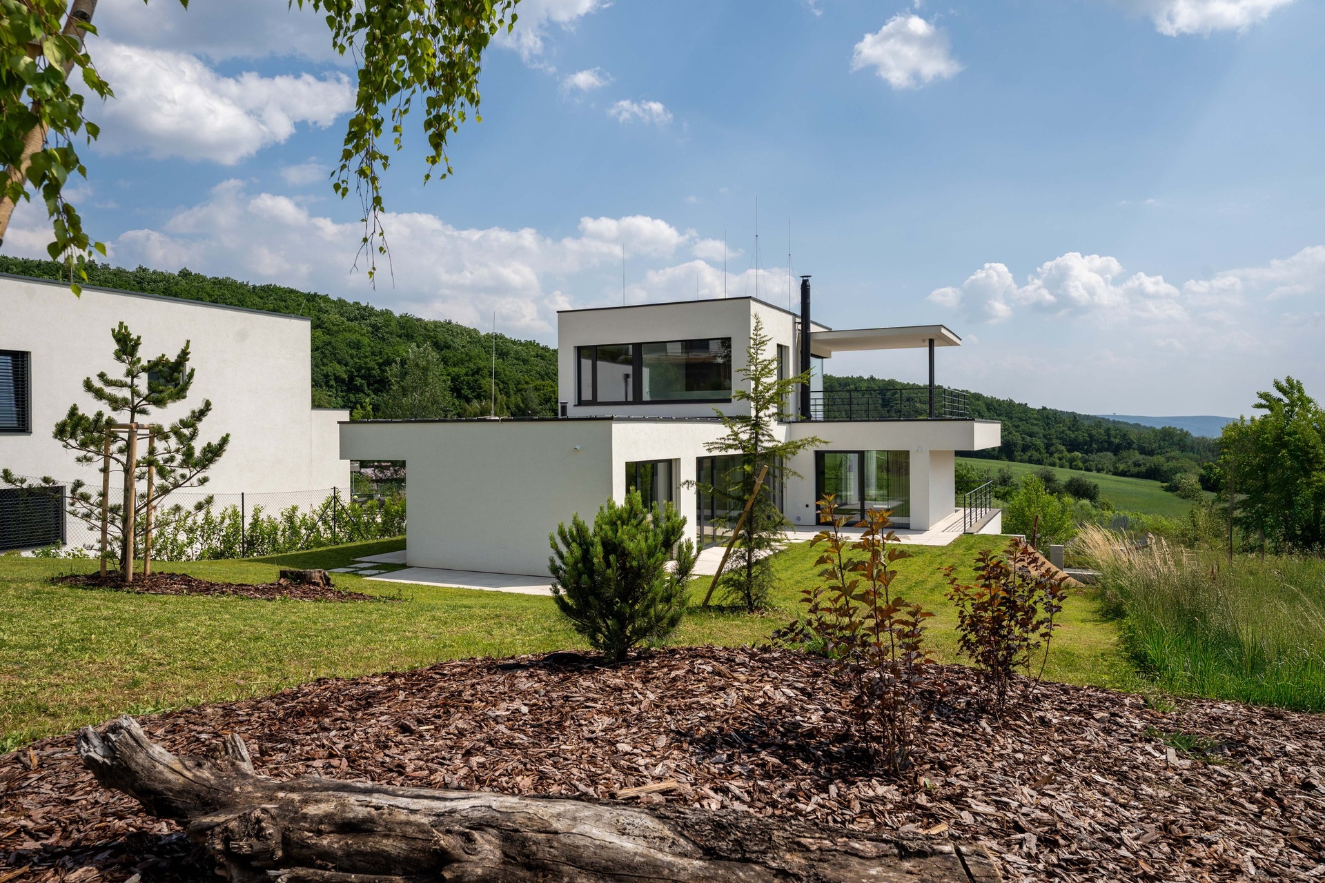 Novostavba vily je citlivě umístěna v mírně svažitém terénu pozemku s překrásnými panoramatickými výhledy do okolní krajiny.