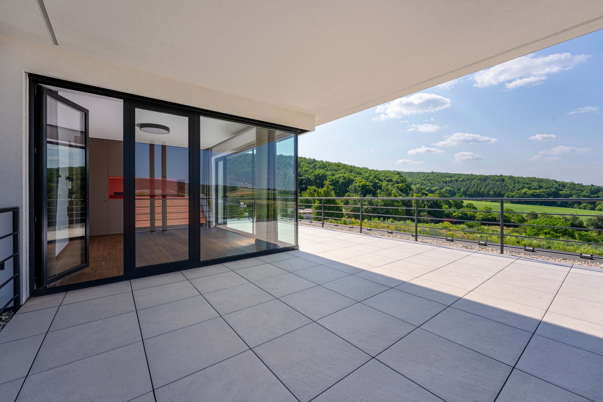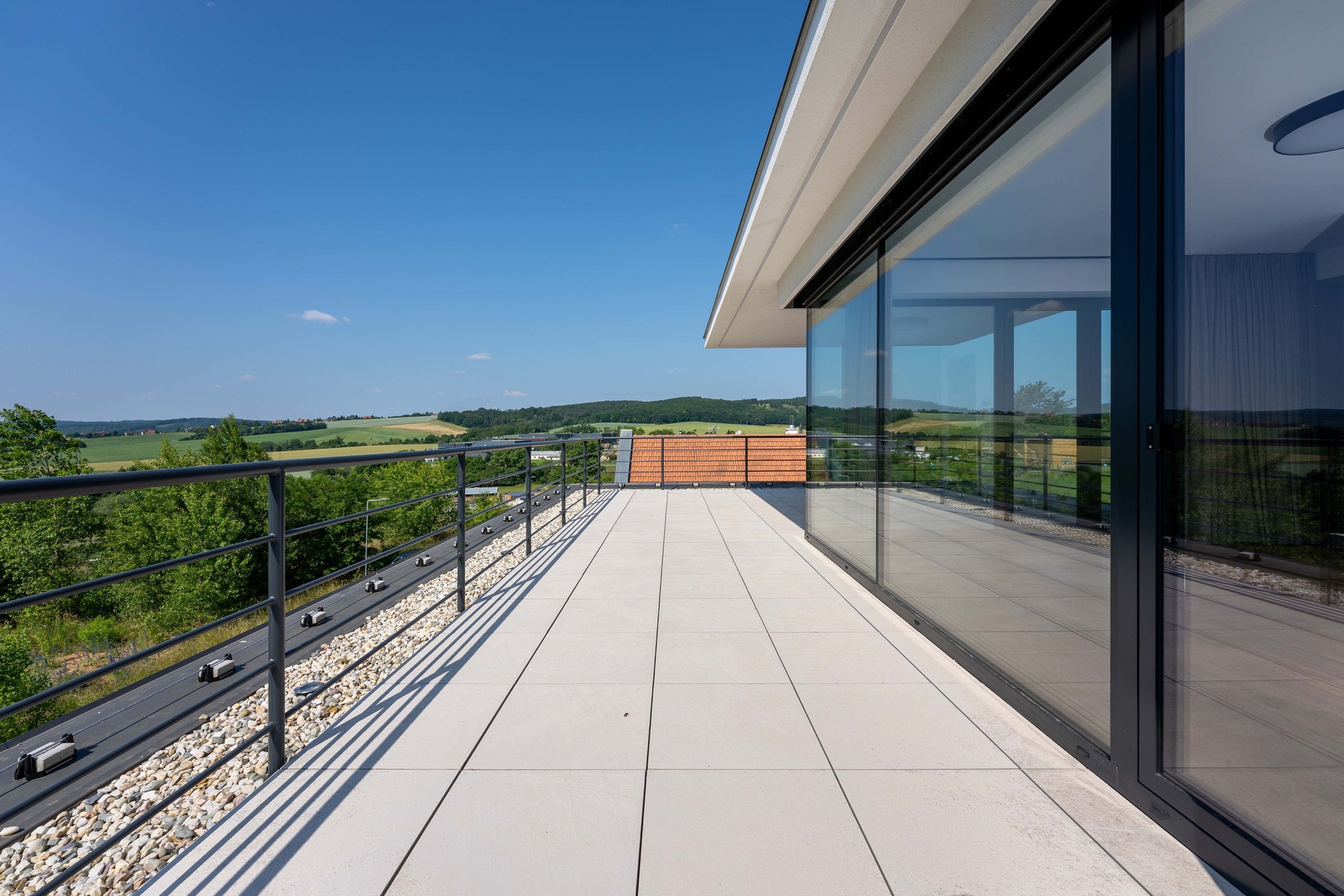 Celou budovu lemují terasy s designovým večerním osvětlením navazující na obytný prostor.