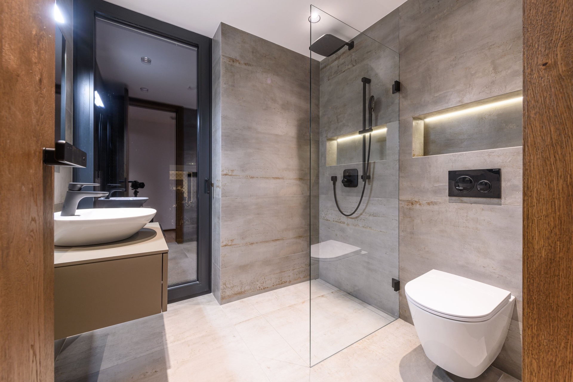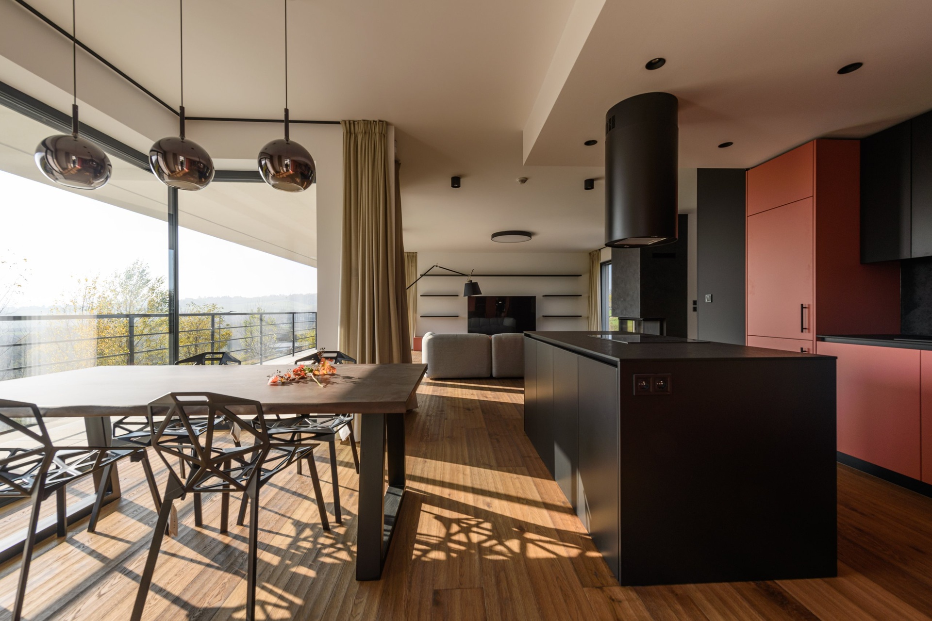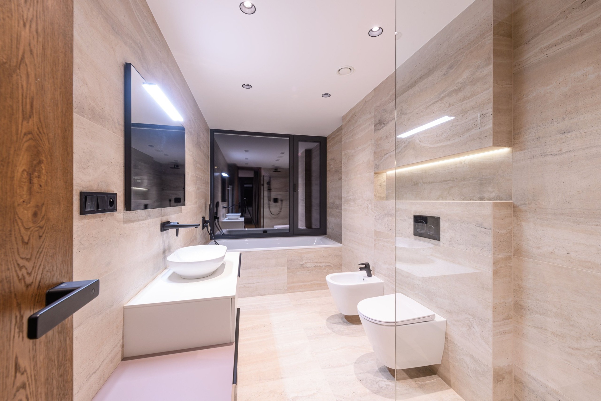Celou budovu lemují terasy s designovým večerním osvětlením navazující na obytný prostor.