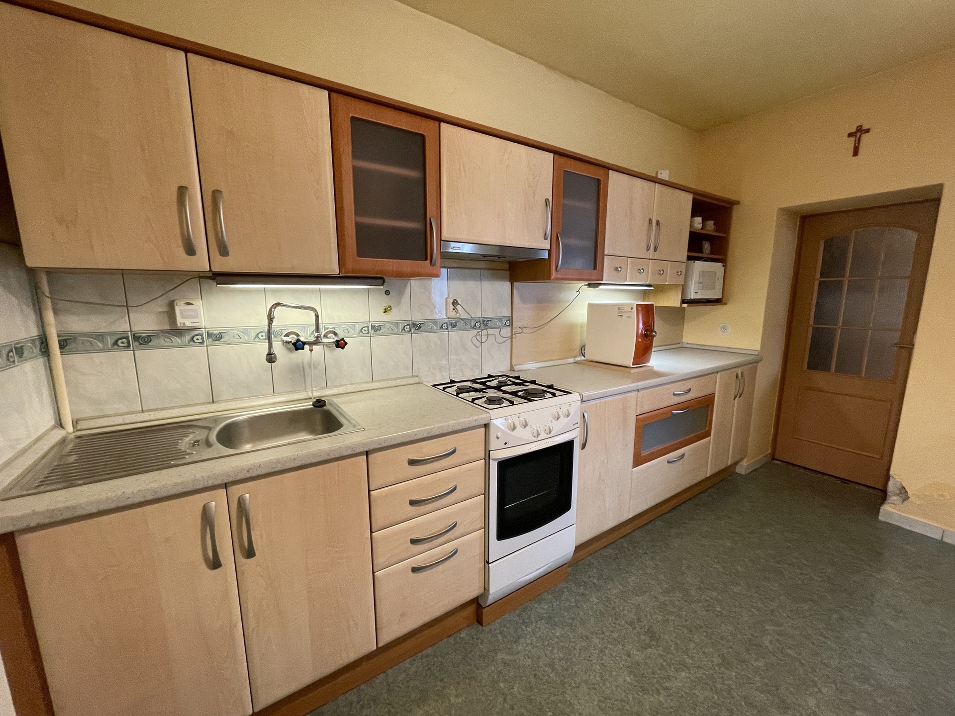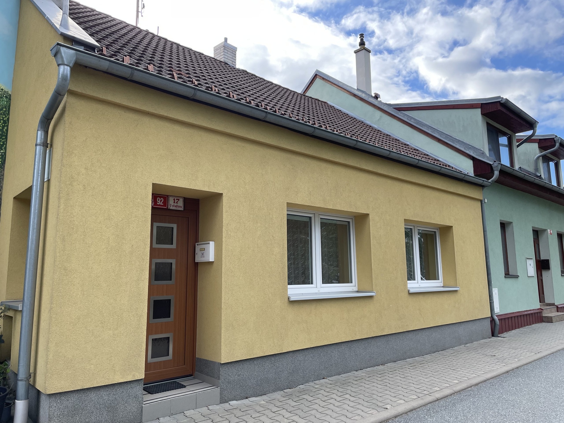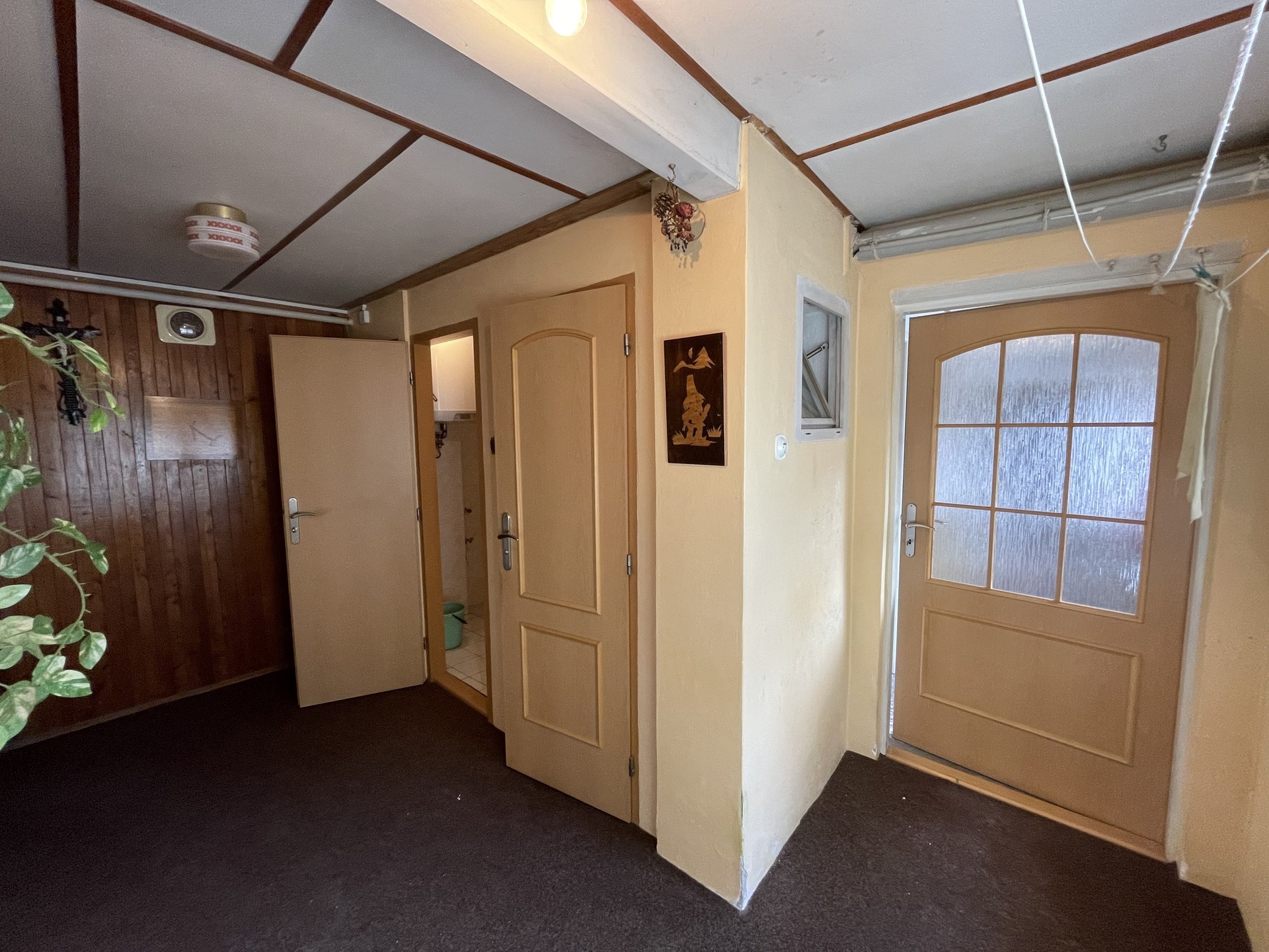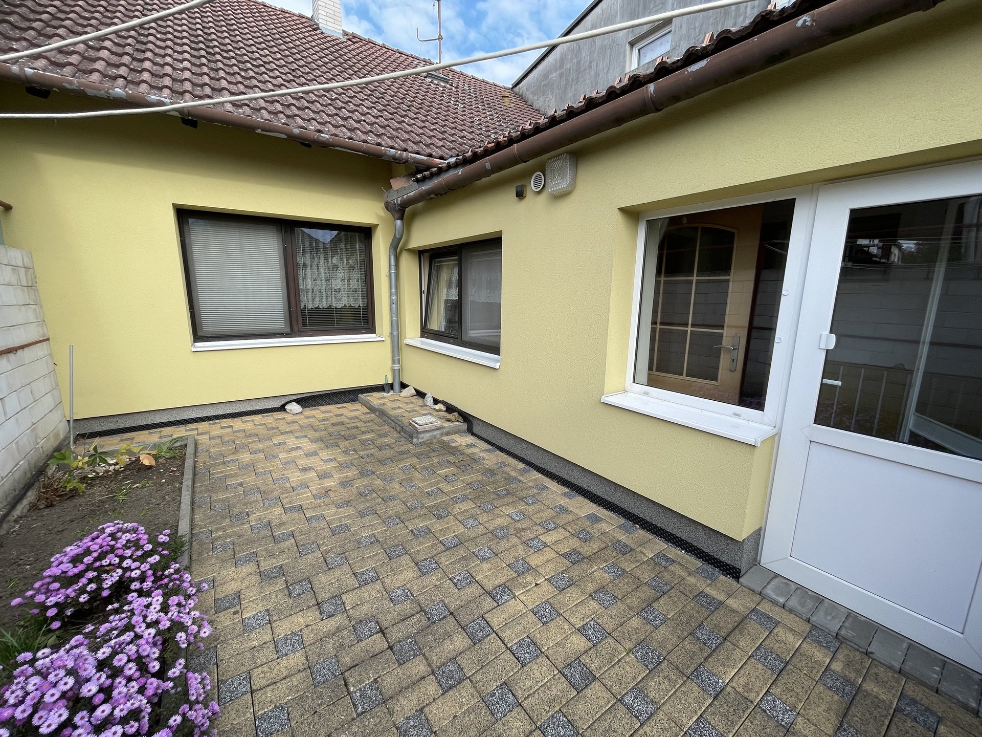 Z hlavní chodby se vstupuje do 2 pokojů a dále do kuchyně se vstupem do dalšího pokoje. Na vstupní chodbu navazuje hala, kde se nachází prostorná koupelna, samostatné WC a místnost na pračku a sušičku nebo šatnu. Z tohoto prostoru se dostanete na vydlážděnou terasu osázenou květinami, která vybízí k posezení a relaxaci. Na tento dvorek navazuje venkovní prostor, ze kterého je možné vybudovat malou zahrádku na bylinky a zeleninu nebo zde může být menší bazén. Vedle sociálního zázemí se nachází pokoj se samostatným vstupem a za ním je vchod na půdu a do dílny. Tento prostor je s domem propojen a nabízí řadu možností využití. Na půdu vede dřevěné schodiště, kde lze vybudovat další obytné prostory. Na dílnu navazuje další dvorek, kterým je možné vyjít za dům, do venkovní proluky.