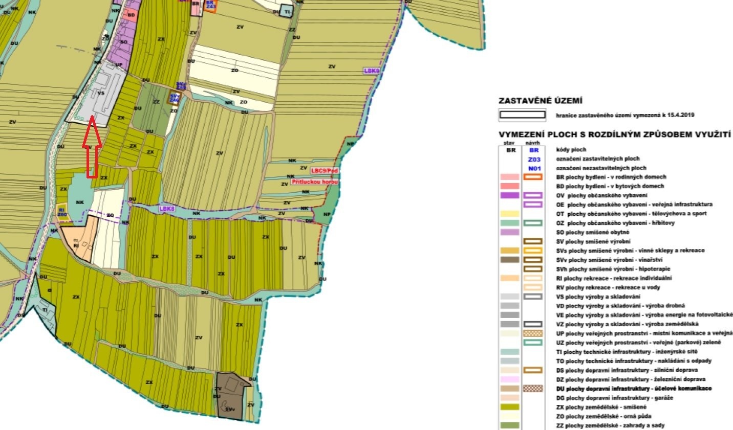 Dle platného Územního plánu obce pozemky spadají do ploch VS (tj. plochy výroby a skladování). Informace o Územním plánu této lokality jsou zveřejněny níže pod popisem aukce v souborech pdf.