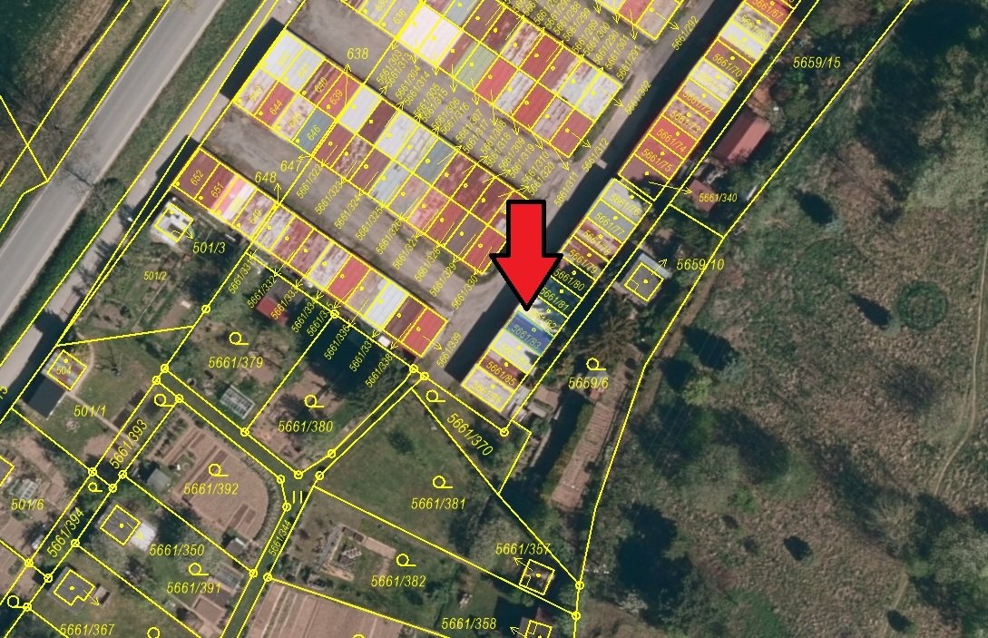 Garáž č.e. 738 stojí na pozemku parc. č. 5661/83 (parcela ve vlastnictví jiného vlastníka – Statutárního města Jihlava, list vlastnictví 10001)