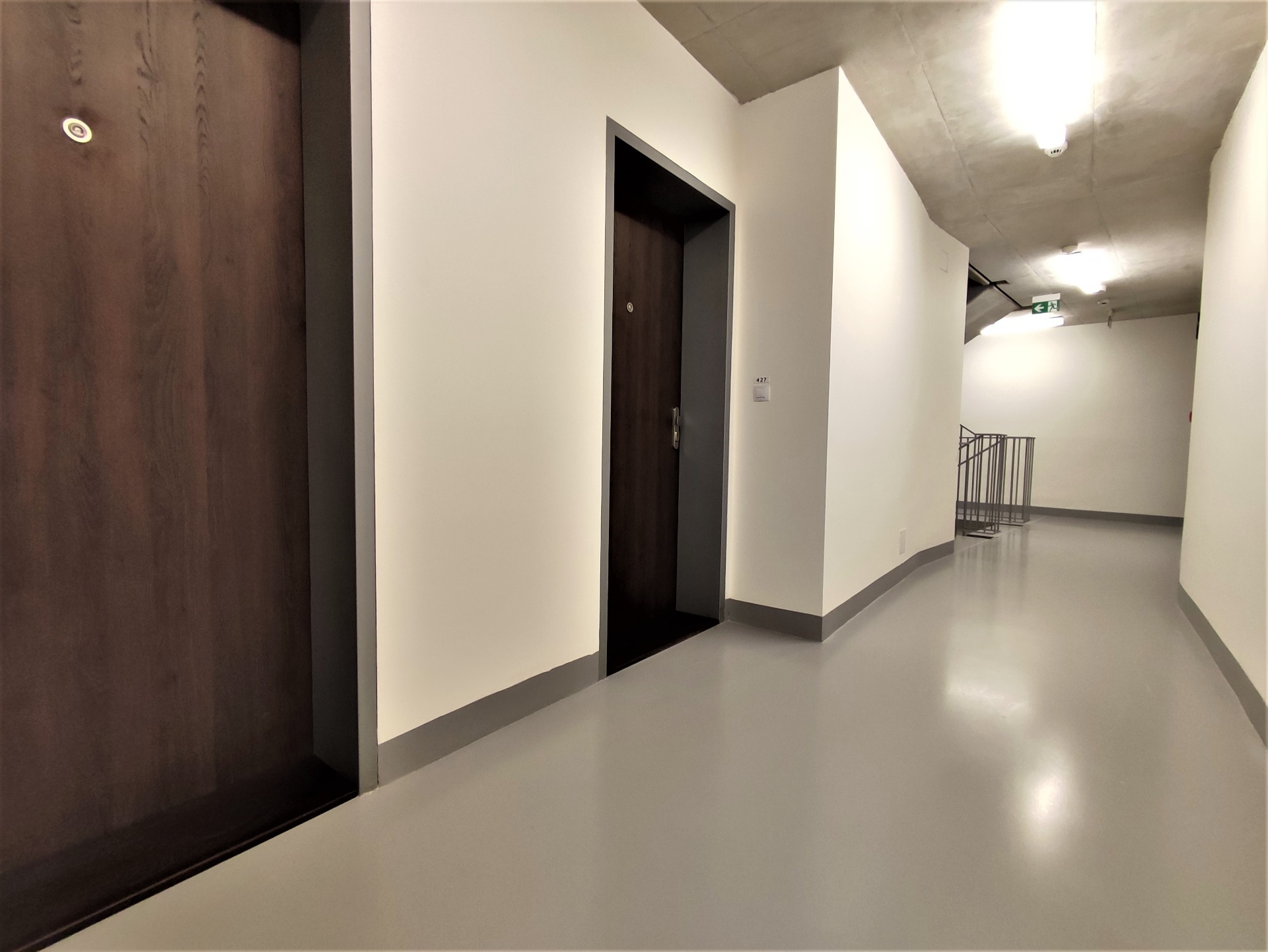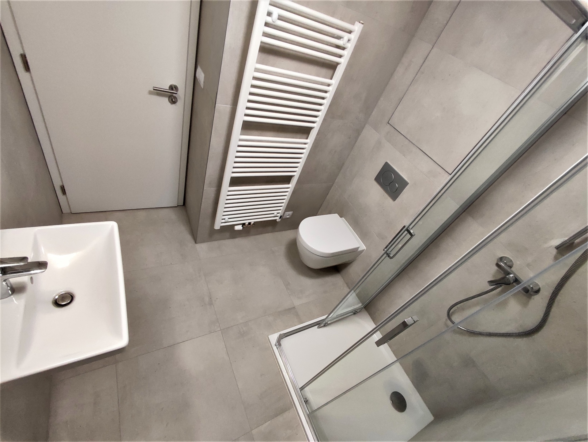 Dispozice: předsíň 3,2 m², koupelna + WC 4,2 m², kuchyňský kout 5,3 m², obytný prostor 14,6 m² (celkem 29,1 m² + balkon 8,3 m² sklepní kóje)