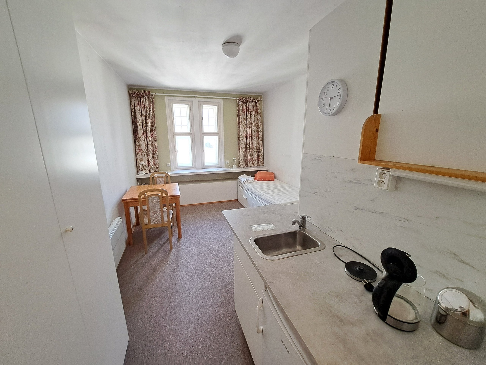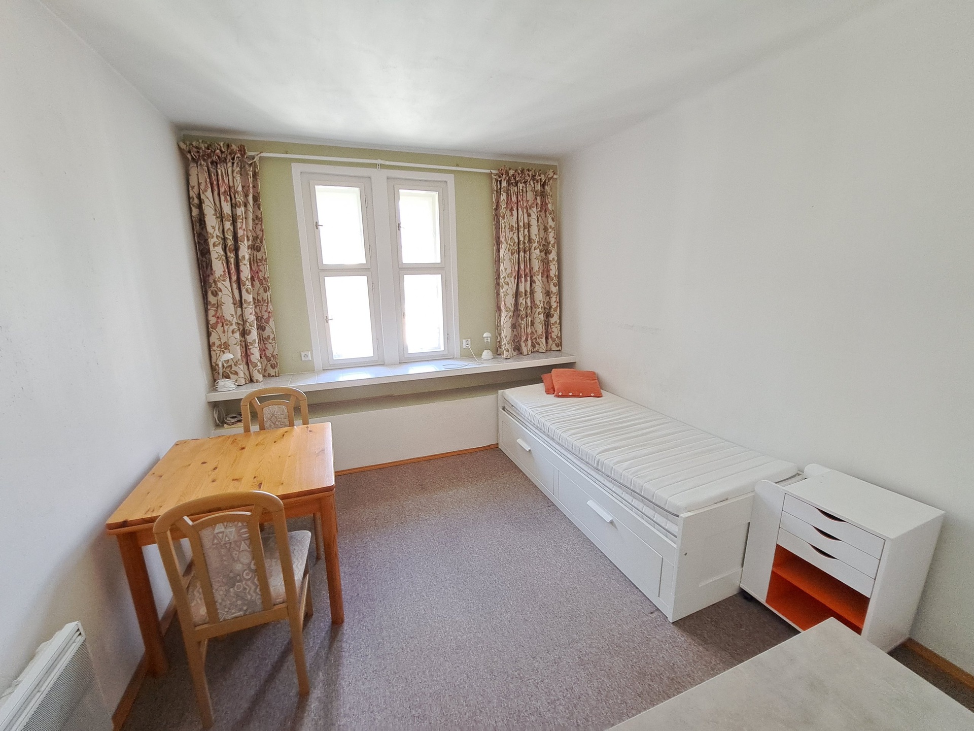 Pokoj s rozkládací postelí, noční stolek, 2x skříň, jídelní stůl a 2x židle. Kuchyňská linka se spotřebiči (lednice, elektrický vařič, možnost MV trouby, dřez, baterie, rychlovarná konvice).