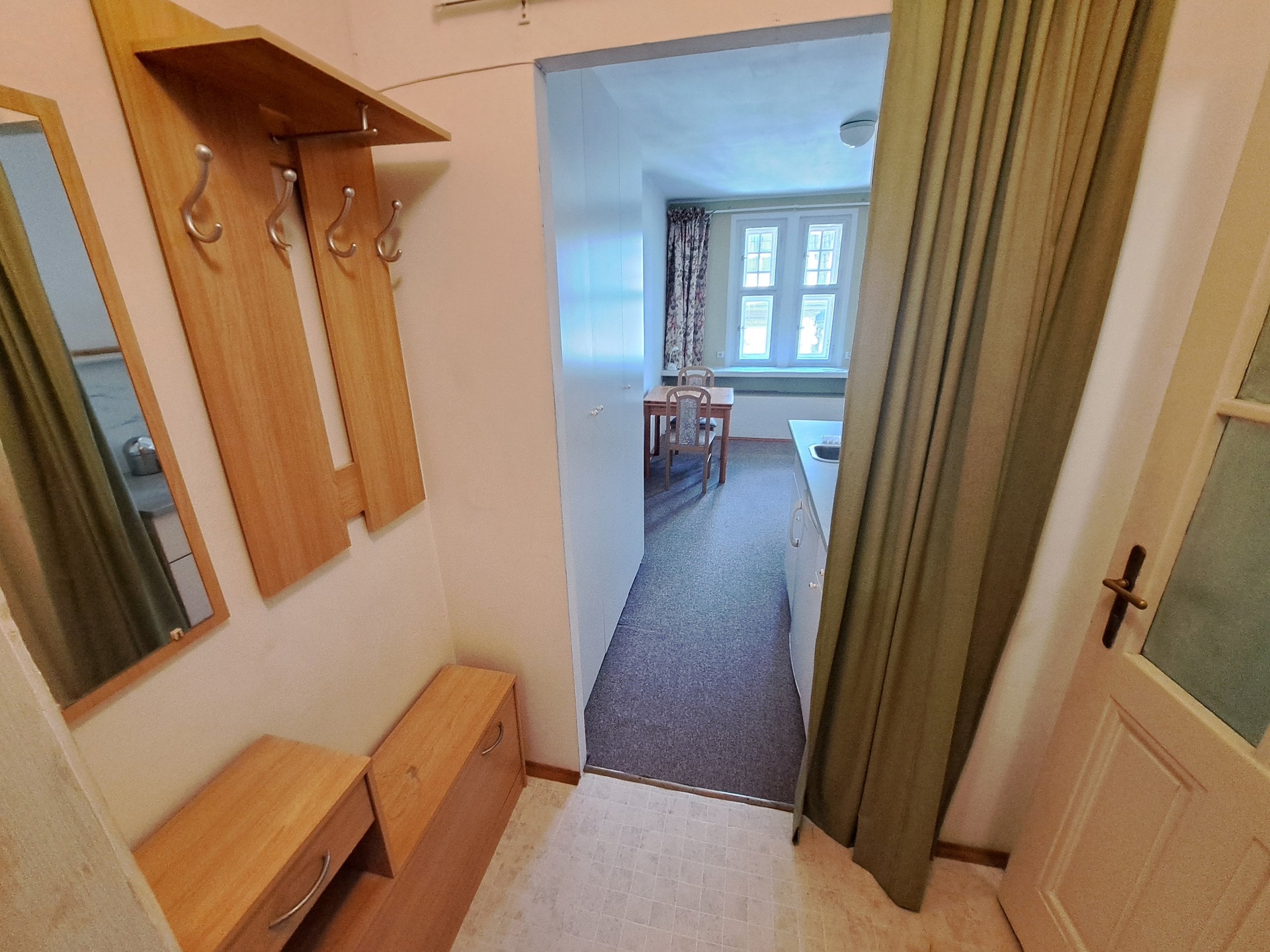 Vstupní chodba s věšáky a botníkem. Koupelna se sprchovým koutem, umyvadlem, WC a pračkou.