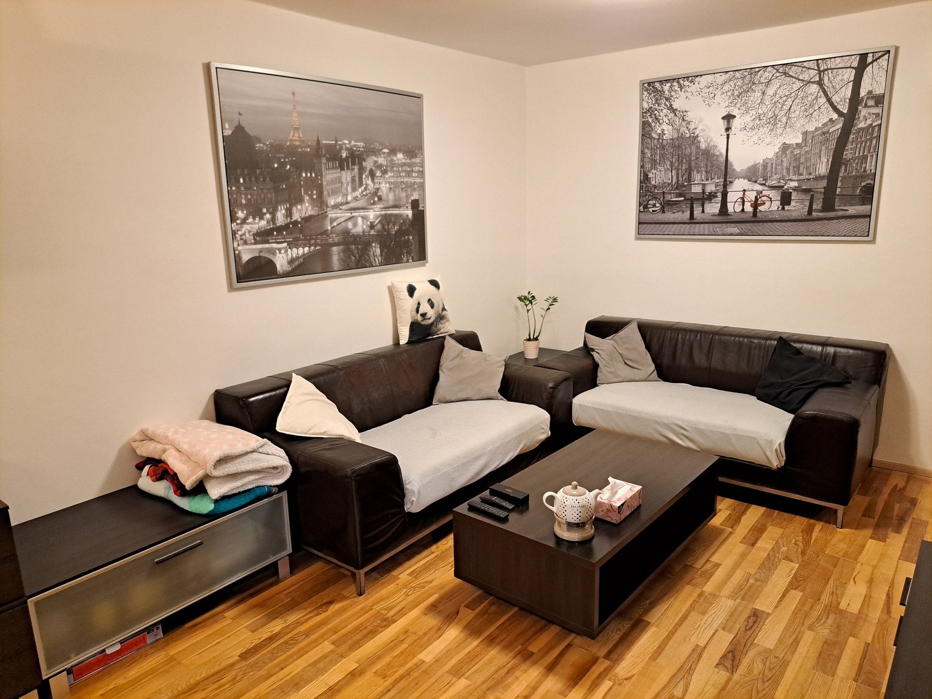 Pokoj č.1 (kožený sedací set, 2x stolek, TV stolek, obývací stěna, 4x skříň, klimatizace, 4x nástěnná skříň).