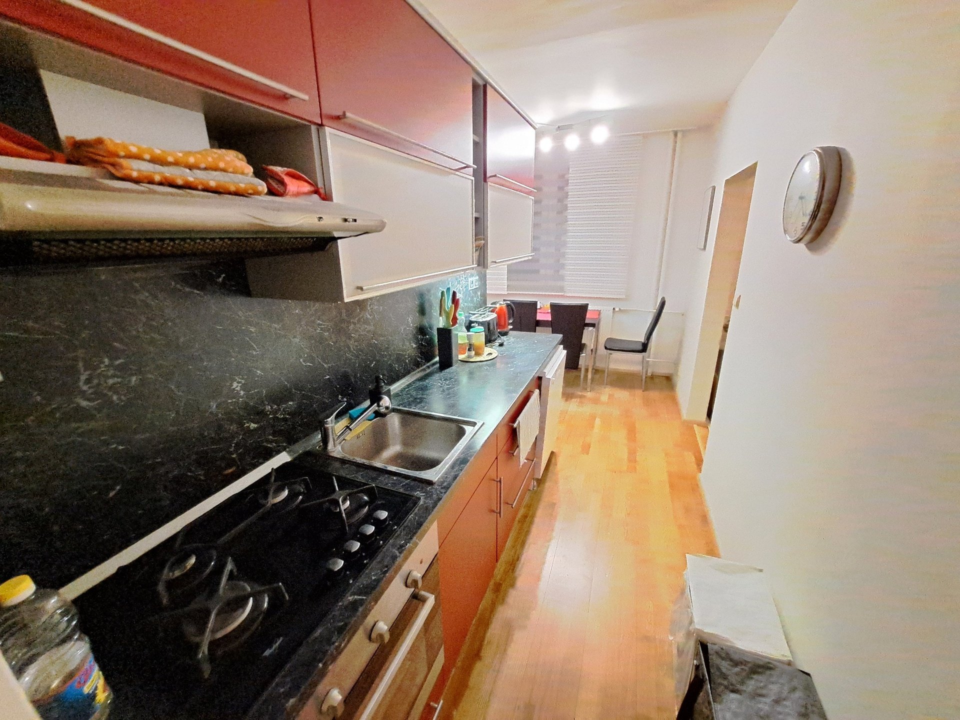 Kuchyňská linka zn. Gabon se spotřebiči (plynová varná deska, elektrická trouba, digestoř, lednice s mrazákem, mikrovlnná trouba, myčka 60 cm, jídelní stůl a 4 židle).
