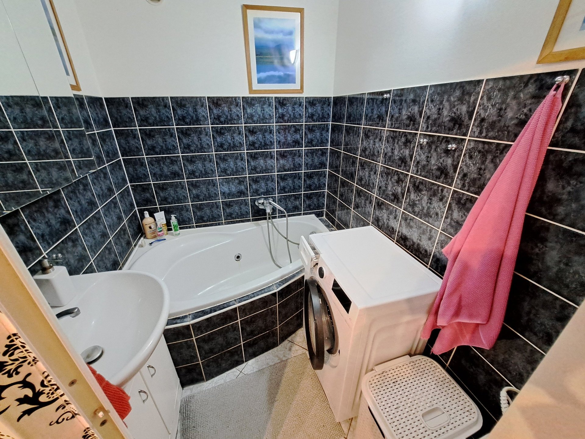 Koupelna (vana, umyvadlo se skříňkou + vod. baterie, zrcadlová skříň, velká skříň, pračka). WC (kombi + umývátko).